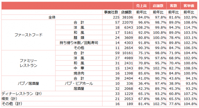 業態別では、ファストフード3.4%減、ディナーレストラン34.9%減、ファミリーレストラン24.9%減。ファストフードはコロナ感染の再拡大による巣ごもり需要が続き、ドライブスルー、テイクアウト・デリバリーが好調だった。