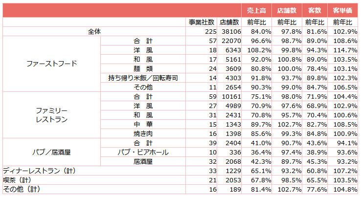 8月外食産業統計|前年比84%/感染再拡大と帰省自粛で再びマイナス