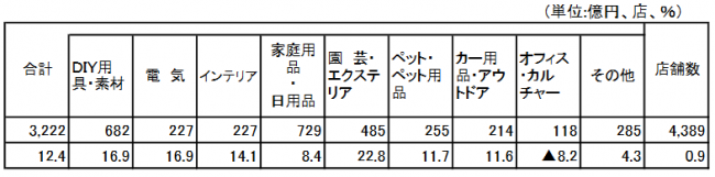 カテゴリー別に見ると、園芸・エクステリアが22.8%増、電気が16.9%増、DIY用具・素材が同じく16.9%増、インテリアが14.1%増、ペット・ペット用品が11.7%増、カー用品・アウトドアが11.6%増、家庭用品・日用品が8.4%増、その他が4.3%の増加となった。一方、オフィス・カルチャーが8.2%の減少となった。