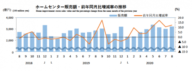 経済産業省発表の「商業動態統計速報」によるホームセンター8月の販売額は3222億円で、前年同月比12.4%の増加となった。総店舗数は7月から12店舗増えて、4389店舗。