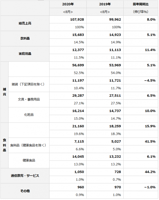 商品別に見ると、衣料品は前年同月比5.1%増、家庭用品は11.4%増、雑貨5.1%増、食料品15.9%増、通信教育・サービス44.2%増。前月に続きすべてのカテゴリーが伸長した。