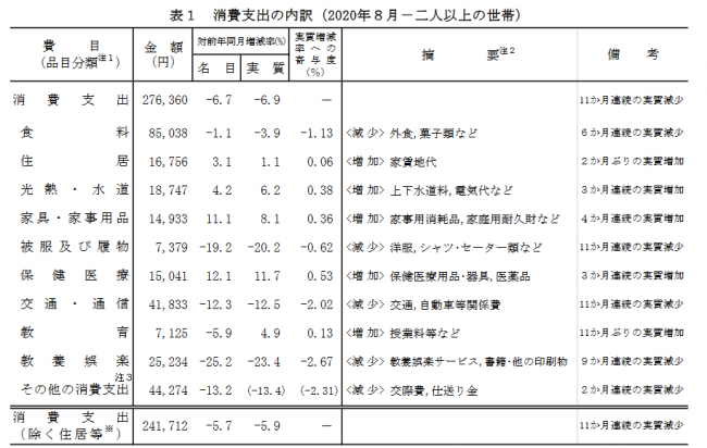 総務省統計局発表の「家計調査報告」によれば、8月の2人以上の世帯の消費支出は27万6360円と、物価変動の影響を取り除いた「実質」で前年同月比6.9%減少した。8月は例年夏休み需要、帰省需要で消費が活発となるが、コロナ禍で前年実績を大幅に下回った。また前年同月を下回るのは消費税率を10%に引き上げた2019年10月から11カ月連続となった。