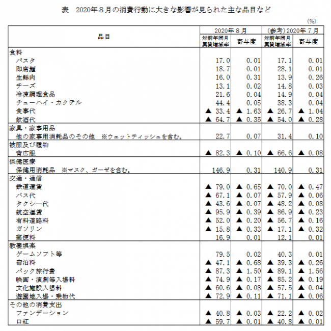 前年同月と比べた8月の消費行動で大きな影響が見られた主な品目は、「教養娯楽」のパック旅行費87.3%減、映画・演劇等入場料74.9%減、遊園地入場・乗物代72.9%減、文化施設入場料60.6%減。また、「交通・通信」の航空運賃95.9%減、鉄道運賃79.0%減、バス代67.1%減、有料道路料52.0%減も、外出自粛の影響が続いている。「食料」の飲酒代64.7%減、食事代33.4%減など、夏休み期間中の旅行や帰省などの自粛が大きく影響している。