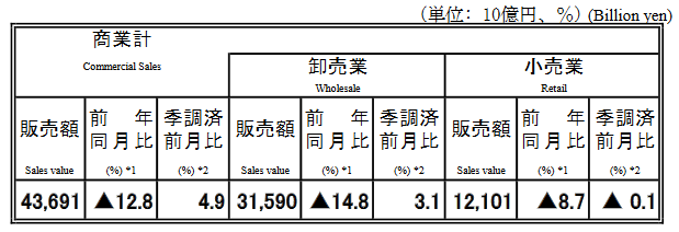 その9月の商業販売額は43兆6910億円で前年同月比マイナス12.8%となった。商業販売額は小売業と卸売業の合計販売額である。