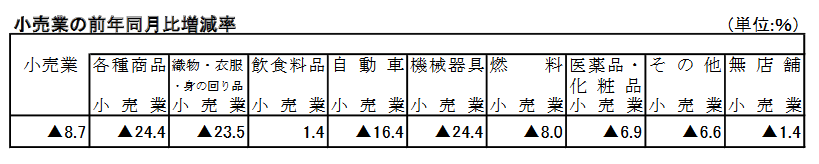 飲食料品小売業が1.4%増で、業種で見ると飲食料品だけが増収。百貨店などの各種商品小売業は前年同月比24.4%減ともっとも減収額が大きい。また織物・衣服・身の回り品小売業が23.5%減、医薬品・化粧品小売業が16.9%減。無店舗小売業も1.4%減だった。