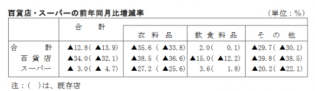 また百貨店・スーパー販売額は1兆5681億円の前年同月比12.8%のマイナス。スーパーは1兆1973億円の3.0%減(既存店は4.7%減)だったが、百貨店は3708億円の34.0%減(既存店は32.1%減)の大幅な落ち込みが続く。商品別では衣料品が35.6%減少したが、飲食料品は2.0%増加した。