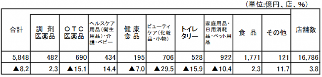 カテゴリー別に見ると、ビューティケア(化粧品・小物)が29.5%減、トイレタリーが15.9%減、OTC医薬品が15.1%減、家庭用品・日用消耗品・ペット用品が10.4%減、健康食品が7.0%の減少となった。一方、ヘルスケア用品(衛生用品)・介護・ベビーが14.4%増、その他が11.7%増、食品が2.3%増、調剤医薬品が2.3%の増加となった。