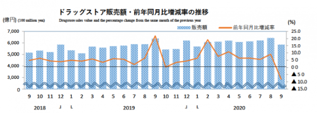 経済産業省発表「商業動態統計速報」によれば、9月のドラッグストア販売額は5848億円、前年同月比8.2%マイナスとなった。店舗数は前年より3.8%増加して1万6786店で、前月に比べて54店舗増えている。