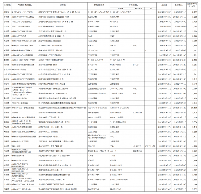 最大面積の物件は、名古屋市中志段味特定土地区画整理事業大規模商業施設街区の「コストコホールセール守山倉庫店」で、店舗面積1万0515㎡(3186坪)ガソリンスタンドを併設する。2021年5月12日新設予定で、コストコとしては東海地方で4店舗目、名古屋市初出店となる。