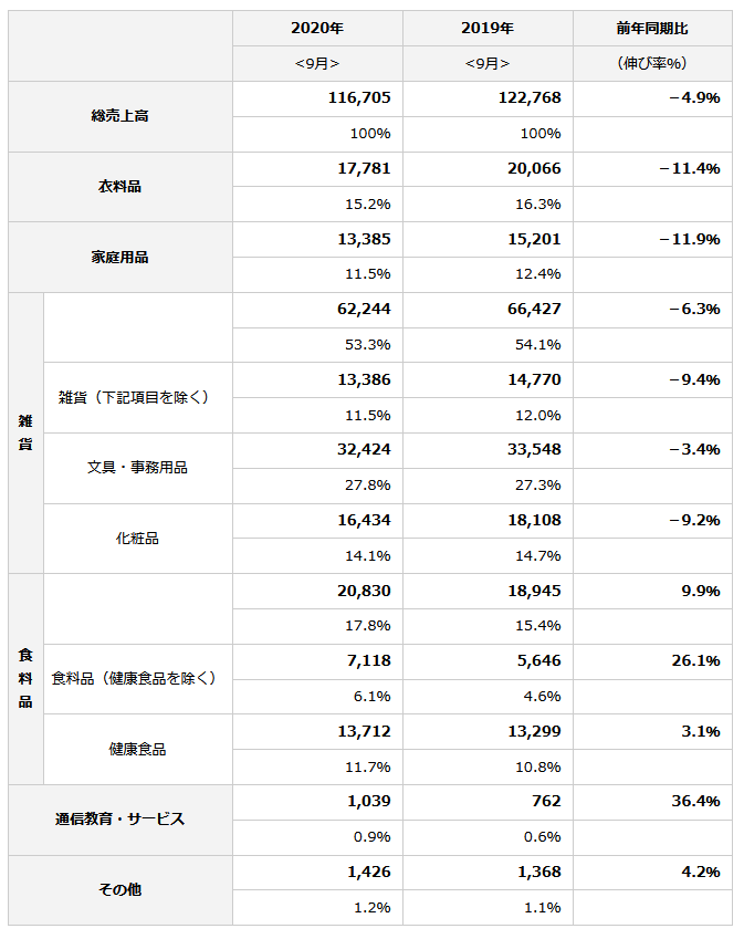 商品別に前年同月比を見ると、増加しているのは、食料品9.9%増、通信教育・サービス36.4%増。とくに健康食品を除く食品は26.1%増となっている。一方、衣料品11.4%減、家庭用品11.9%減、雑貨6.3%減と、前年の消費増税前の駆け込み需要の反動で、税率の上がる商品分野は減少している。