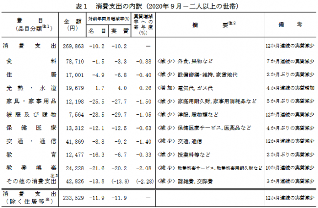 9月家計調査統計|2人以上世帯の実収入2.6%増/消費支出10.2%減