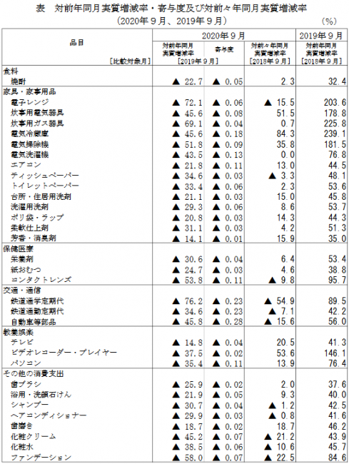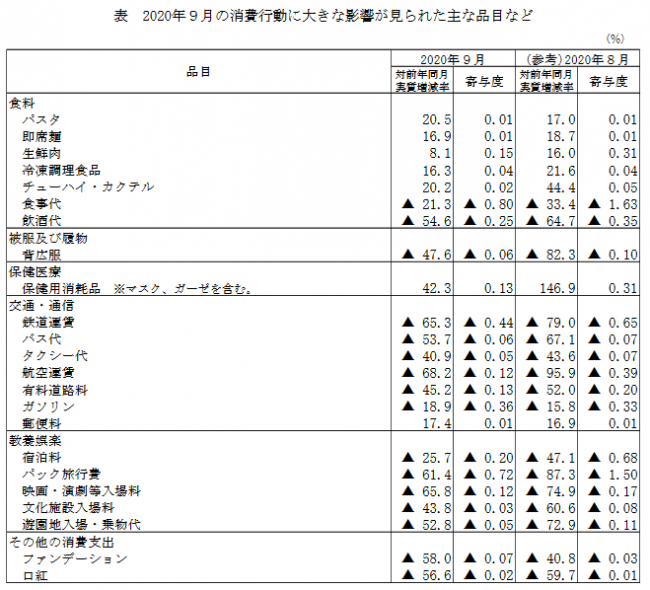 前年同月と比べた9月の消費行動で大きな影響が見られた主な品目は、「教養娯楽」の映画・演劇等入場料65.8%減、パック旅行費61.4%減、遊園地入場・乗物代52.8%減。また、「交通・通信」の航空運賃68.2%減、鉄道運賃65.3%減、バス代53.7%減も外出自粛の影響が続いている。「食料」の飲酒代54.6%減、食事代21.3%減など、マイナス幅は改善してきているが、在宅勤務などによる巣ごもり需要や、外出自粛による影響は続いている。