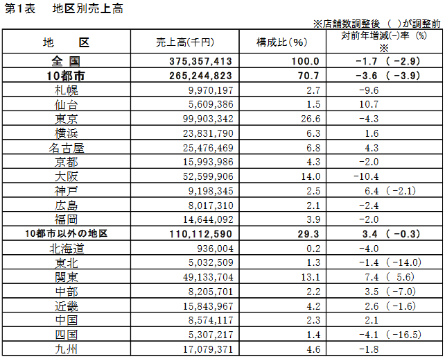 地区別では、大都市の10都市では3.6%減だったが、仙台、横浜、名古屋、神戸の4都市では前年を上回った。また、地方(10都市以外)では、関東、中部、近畿、中国の4地区が前年を上回った。