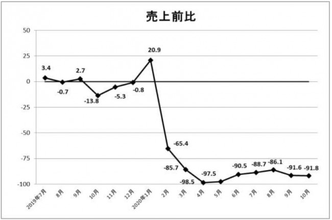 日本百貨店協会のインバウンド推進委員会発表の「外国人観光客の売上高・来店動向」によれば、10月の免税総売上高は前年同月比91.8%減の21億円だった。購買客数は約5000人(前年同月比98.7%減)と、ともに9カ月連続で大きく減少している。