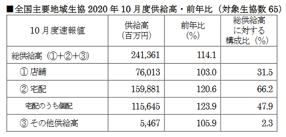 店舗が760億1300万円(前年同月比3.0%増)、宅配が1598億8100万円(20.6%増)。宅配のうち個人宅への宅配「個配」は1156億4500万円23.9%増だった。灯油・葬祭などの「その他供給高」は54億6700万円(5.9%増)。
