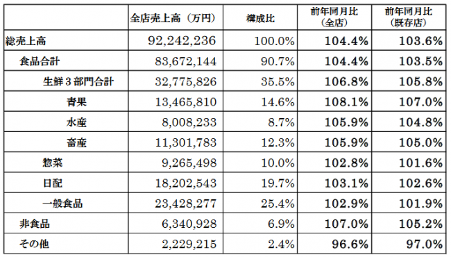 総売上高は9224億2236万円の前年同月比4.4%増。また既存店ベースでは3.6%増と2月以降9カ月連続で増加している。