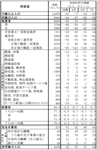 総務省統計局の10月の「労働力調査」によれば、就業者は6694万人と前年同月に比べて93万人減少した。雇用者は前年同月に比べて48万人減少の5998万人。7カ月連続で減少が続いている。就業率は60.4%と、前年同月に比べ0.8ポイントの低下となった。