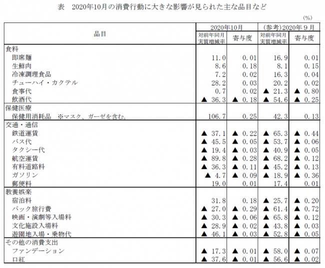 新型コロナウイルス感染症拡大によって、消費行動に大きな影響が見られた主な品目は、「教養娯楽」の遊園地入場・乗物代46.1%減、映画・演劇等入場料30.3%減、文化・施設入場料28.9%減、パック旅行費27.0%減。また、「交通・通信」の航空運賃89.8%減、バス代45.5%減、鉄道運賃37.1%減、有料道路料36.3%減も外出自粛の影響が続いている。「食料」の飲酒代36.3%減は前月と比較してマイナス幅が改善した。一方で、GO TOキャンペーンが実施されたことで「教養娯楽」の宿泊料31.8%増、「食料」の食事代0.7%増は増加に転じた。