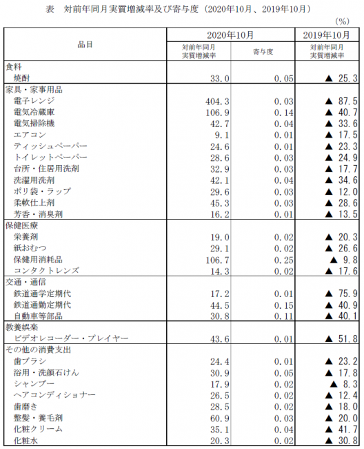 また、2019年10月の消費税率引上げ直前の駆け込みの反動が見られた主な品目で、大きな増加となったのは、「家具・家事用品」の電子レンジ404.3%増、電気冷蔵庫106.9%増、電気掃除機42.7%増だった。