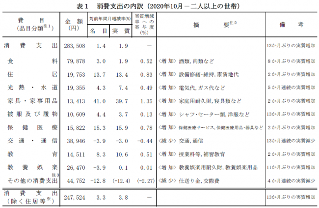 費目別消費支出(2人以上世帯)では「交通・通信」と「教養・娯楽」がともに3.9%減少、「その他の消費支出」が12.8%減少したが、そ例外の費目ではすべて増加している。とくに大きく支出が増加したのは41.0%増の「家具・家事用品」、15.3%増の「保険医療」、13.7%の「住居」だった。