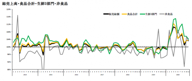 スーパーマーケット販売統計11月度が発表された。一般社団法人日本スーパーマーケット協会(JSA)、オール日本スーパーマーケット協会(AJS)、一般社団法人全国スーパーマーケット協会(NSAJ)の会員企業のうちのパネル270社の調査だ。