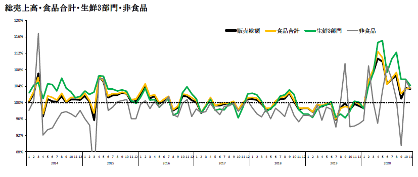 11月スーパーマーケット統計|総売上高4.4%増・既存店3.3%増/生鮮部門好調