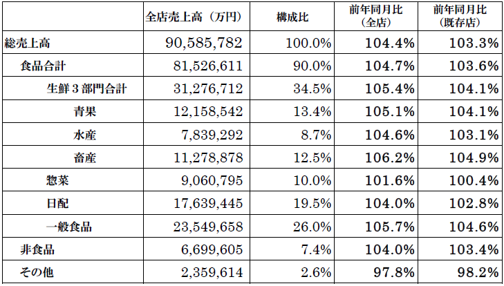 売上げの内訳は、食品が8152億6611万円(前年同月比3.6%増)、非食品669億9605万円(3.4%増)、その他235億9614万円(1.8%減)。