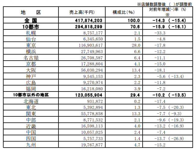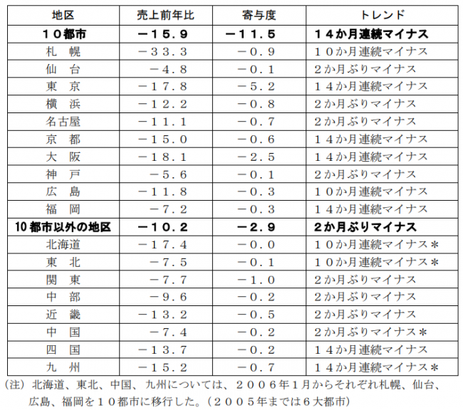 地区別では大都市の10都市が15.9%減、地方(10都市以外)が10.2%減と、すべての都市で前年割れだった。特に、月初から感染症再拡大の影響を受けた札幌は33.3%減と大幅なマイナスだった。