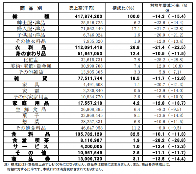 11月百貨店統計|売上高4179億円14.3%減/コロナ再拡大で14カ月連続減収