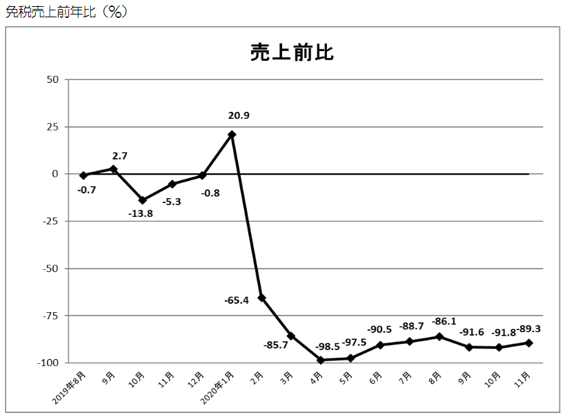 日本百貨店協会のインバウンド推進委員会発表の「外国人観光客の売上高・来店動向」によれば、11月の免税総売上高は前年同月比89.3%減の約27億9000万円だった。購買客数はわずかに7000人ほどで、前年同月比98.2%減。