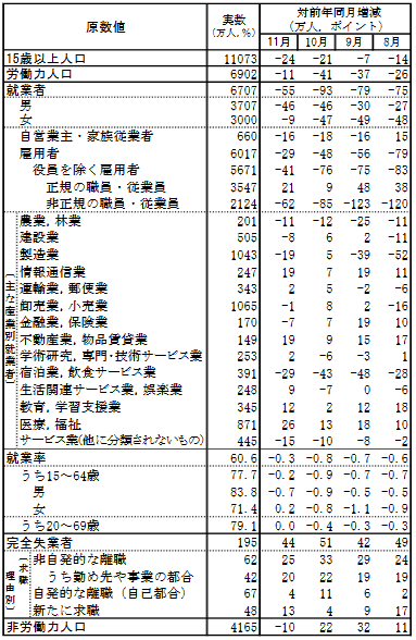総務省統計局の11月の「労働力調査」によれば、就業者は6707万人と前年同月に比べて55万人減少した。雇用者は前年同月に比べて29万人減少の6017万人。8カ月連続で減少が続いている。就業率は60.6%と、前年同月に比べ0.3ポイントの低下となった。