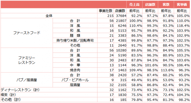 11月の調査対象企業数は前月より6社減って215社、店舗数は255店減って3万7674店舗。その中でファストフードは2万1807店舗と全体の58%を占めている。