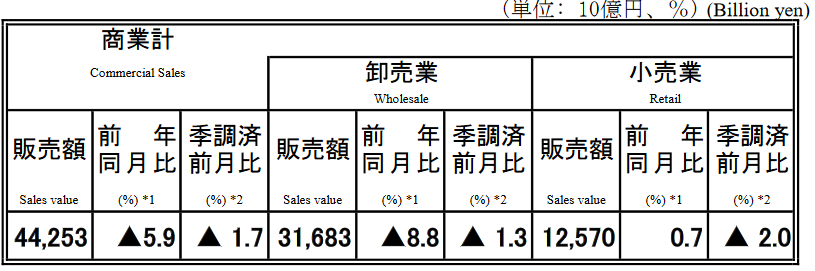 11月商業動態統計|販売額44兆2530億円5.9%減/小売業12.5兆円0.7%増