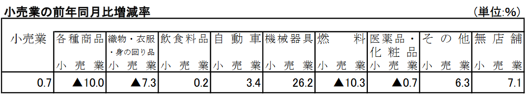 業種別にみると、機械器具小売業が前年同月比26.2%増、無店舗小売業が7.1%増、自動車小売業が3.4%増、飲食料品小売業が0.2%増。一方、燃料小売業が10.3%減、各種商品小売業(百貨店など)が10.0%減、織物・衣服・身の回り品小売業が7.3%減、医薬品・化粧品小売業が0.7%減だ。