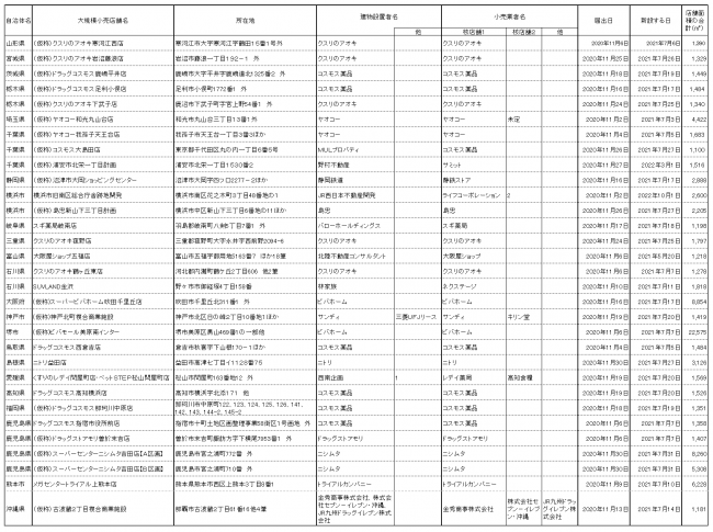 2000坪以上の大型物件は他に2件。同じくLIXILビバが開発する店舗面積8854㎡(2678坪)の「(仮称)スーパービバホーム吹田千里丘店」。2021年7月、大阪府吹田市にオープン予定だ。また鹿児島県の(株)ニシムタが店舗面積8260㎡(2499坪)の「(仮称)スーパーセンターニシムタ吉田店【A区画】」を2021年7月、鹿児島県鹿児島市に開業する予定である。いずれもホームセンターを核とする。