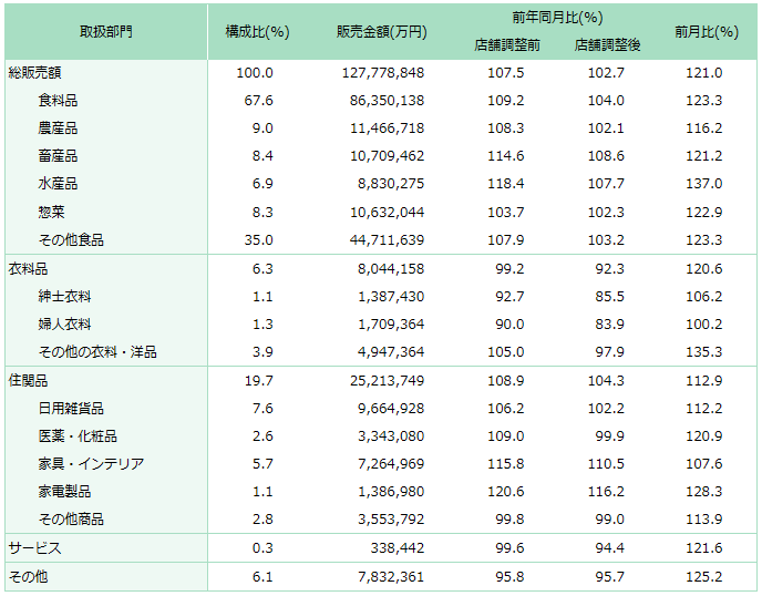 12月度は、新型コロナウイルス感染症感染拡大による外出自粛や年末年始の行動自粛などにより内食化需要が増え、食料品は8635億円、前年同月比9.2%増と好調だった。衣料品は外出自粛などにより苦戦したが、住関品の動きは良かったことから、総販売額の前年同月比でプラスとなった。