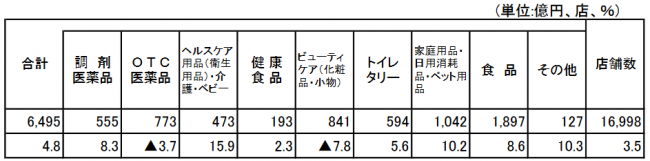 カテゴリー別に見ると、家庭用品・日用消耗品・ペット用品が10.2%増、食品が8.6%増、調剤医薬品が8.3%増、トイレタリーが5.6%増、健康食品が2.3%の増加となった。一方、ビューティケア(化粧品・小物)が7.8%減、OTC医薬品が3.7%の減少となった。