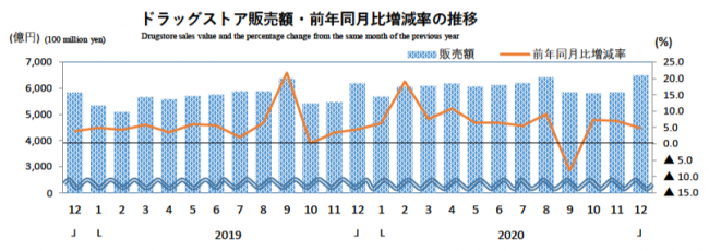 経済産業省発表「商業動態統計速報」によれば、12月のドラッグストア販売額は6495億円、前年同月に比べて4.8%増加した。店舗数は前年より67店舗、率にして3.5%増加して1万6998店。2020年のドラッグストア販売額は7兆2849億円、前年比6.6%の増加となった。