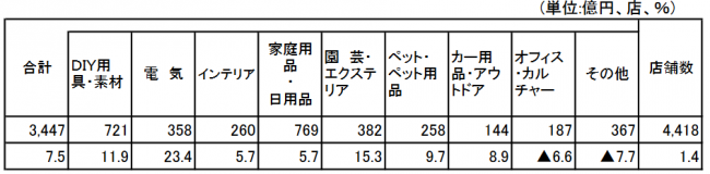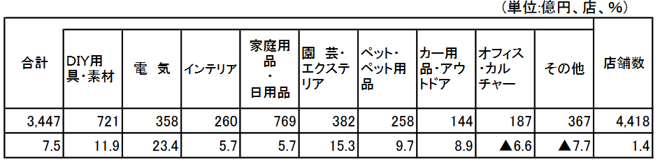 カテゴリー別に見ると、電気が23.4%増、園芸・エクステリアが15.3%増、DIY用具・素材が11.9%増、ペット・ペット用品が9.7%増、カー用品・アウトドアが8.9%増、家庭用品・日用品が5.7%増、インテリアが5.7%の増加となった。一方、その他が7.7%減、オフィス・カルチャーが6.6%の減少となった。
