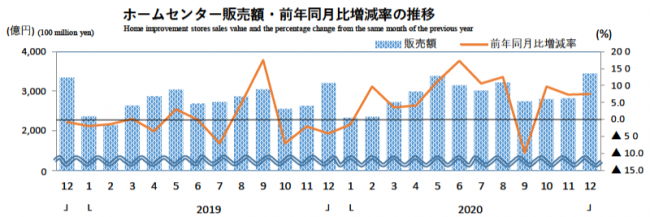 経済産業省発表の「商業動態統計速報」によるホームセンター12月の販売額は3447億円で、前年同月比7.5%増。総店舗数は11月から3店舗増えて、4418店舗。