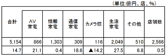 カテゴリー別では、生活家電が27.5%増、AV家電が21.1%増、通信家電が18.6%増、その他が6.8%増、情報家電が0.4%の増加となった。一方、カメラ類が14.2%の減少となった。