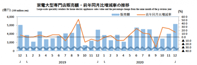 経済産業省が発表する「商業動態統計速報」によれば、12月の家電大型専門店の販売額は5154億円で、前年同月比2.1%増。店舗数は前年比0.5%増で4店舗増えて2566店。2020年の家電大型専門店販売額は4兆7929億円、前年比5.1%の増加となった。