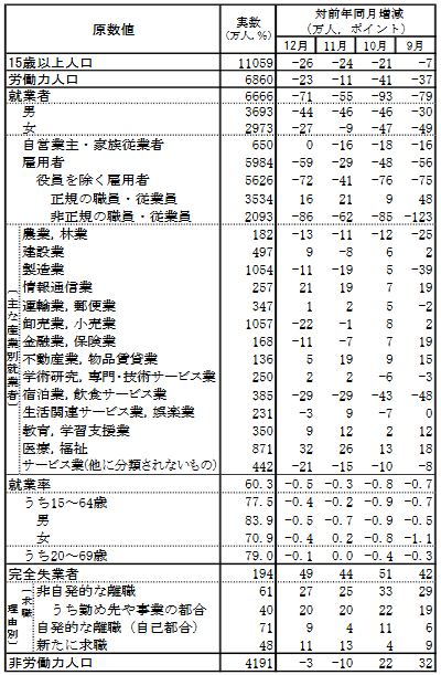 総務省統計局の12月の「労働力調査」によれば、就業者は6666万人と前年同月に比べて71万人減少した。雇用者は前年同月に比べて59万人減少の5984万人。9カ月連続で減少が続いている。就業率は60.3%と、前年同月に比べ0.5ポイントの低下となった。