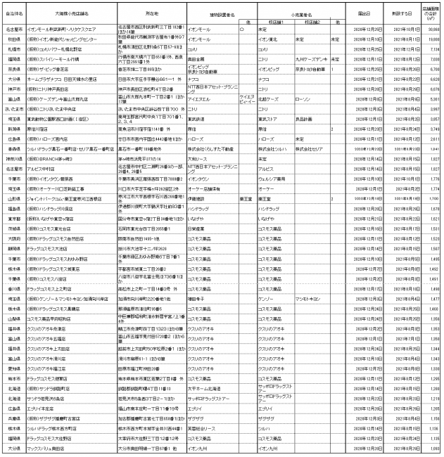 スーパーマーケットは8店、申請されている。新潟県南魚沼市の「原信川窪店」は店舗面積3749㎡(1134坪)。広島県廿日市市の「(仮称)ハローズ宮内店」は2611㎡(790坪)。愛知県名古屋市中村区の「アルビス中村店」は1827㎡(553坪)。埼玉県川口市の「(仮称)オーケー川口芝新築工事」は1774㎡(537坪)。東京都国分寺市の「(仮称)いなげや東恋ヶ窪店」は1621㎡(490坪)。埼玉県加須市の「(仮称)ケンゾー&マツモトキヨシ加須向川岸店」は1477㎡(447坪)。広島県福山市の「エブリイ本庄店」は1205㎡(364坪)。大分県大分市「マックスバリュ奥田店」は1093㎡(331坪)。そして8店舗とも2021年8月にオープンを予定している。