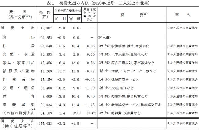 12月家計調査統計|帰省控えで2人以上の消費支出31.5万円0.6%減