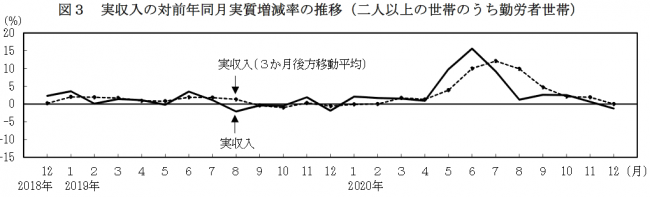 費目別消費支出(2人以上世帯・実質)では、12月は気温が低下したことや外出自粛で、季節家電や空気清浄機などの動きがよく「家具・家事用品」が13.6%増加した。また、授業料や補習教育料の「教育」は16.4%増と3カ月連続で増加している。