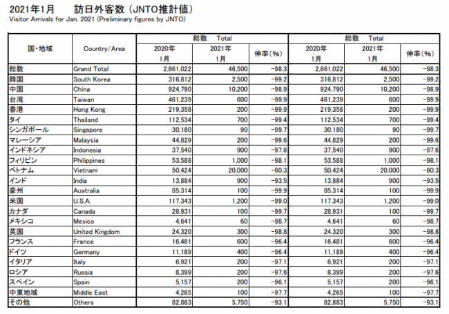 日本政府観光局(JNTO)が発表する2021年1月の訪日外客数は4万6500⼈で前年同月⽐98.3%減だった。16カ月連続で前年同月を下回った。