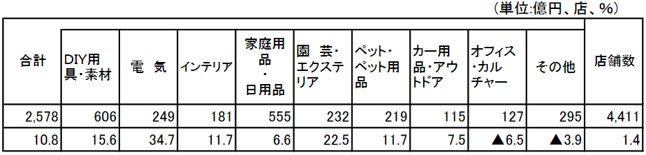 カテゴリー別に見ると、電気が34.7%増、園芸・エクステリアが22.5%増、DIY用具・素材が15.6%増、ペット・ペット用品が11.7%増、インテリアが11.7%増、カー用品・アウトドアが7.5%増、家庭用品・日用品が6.6%増が好調。一方、オフィス・カルチャーが6.5%減。