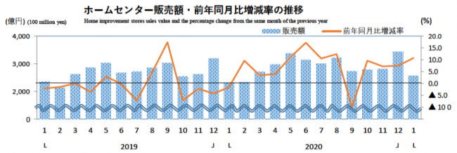 経済産業省発表の「商業動態統計速報」によるホームセンター1月の販売額は2578億円で、前年同月比10.8%増。総店舗数は12月から7店舗減って、4411店舗。