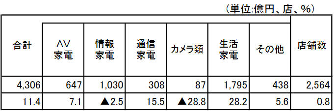 カテゴリー別では、生活家電が28.2%増、通信家電が15.5%増、AV家電が7.1%増、その他が5.6%の増加となった。一方、カメラ類が28.8%減、情報家電が2.5%の減少だ。